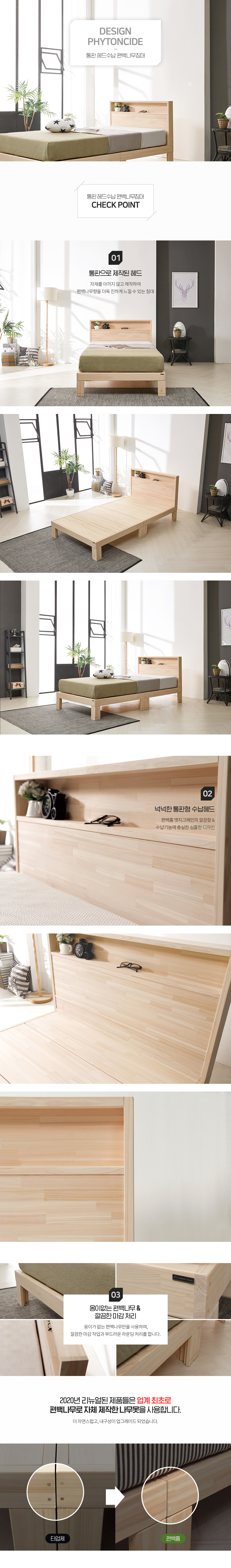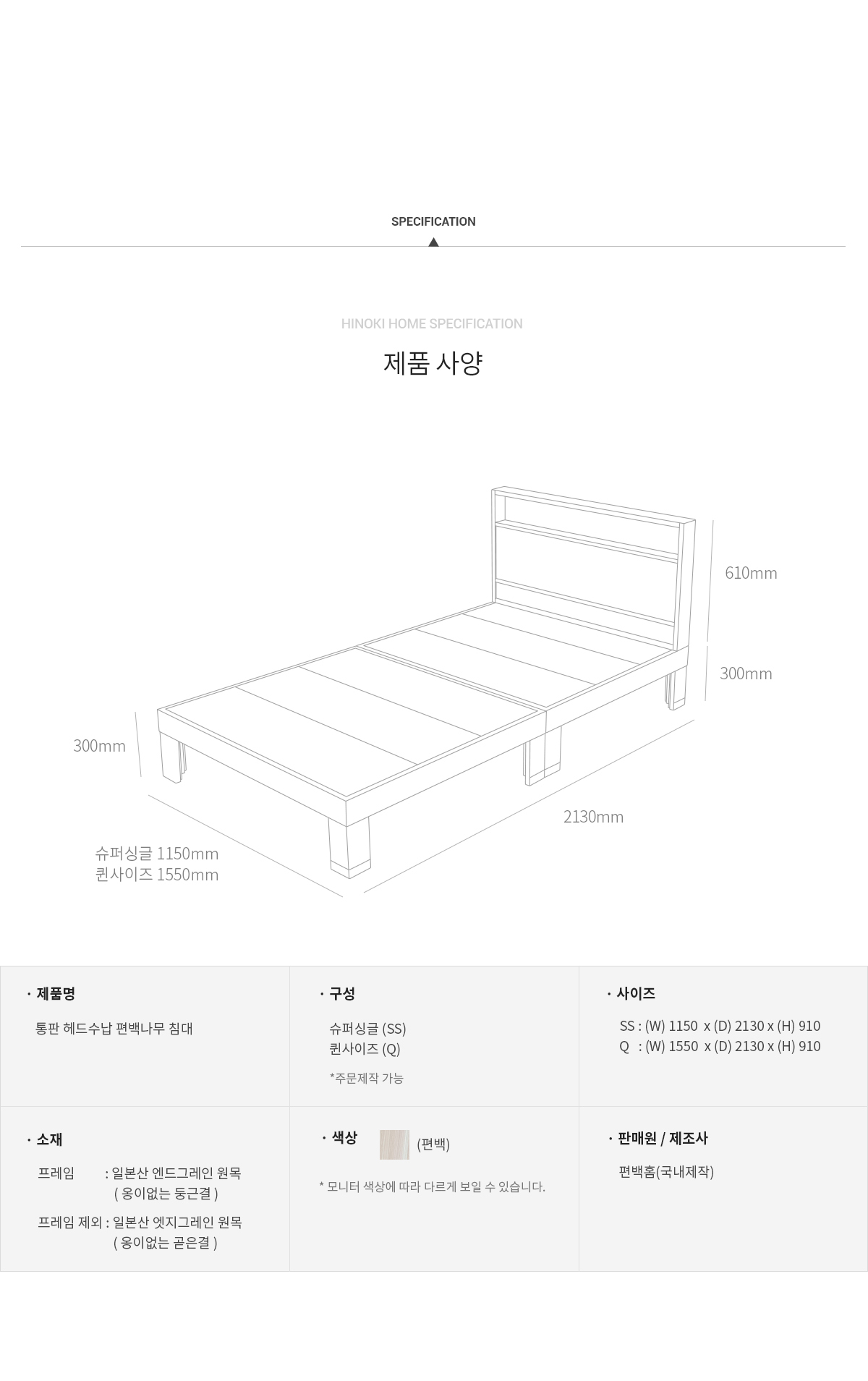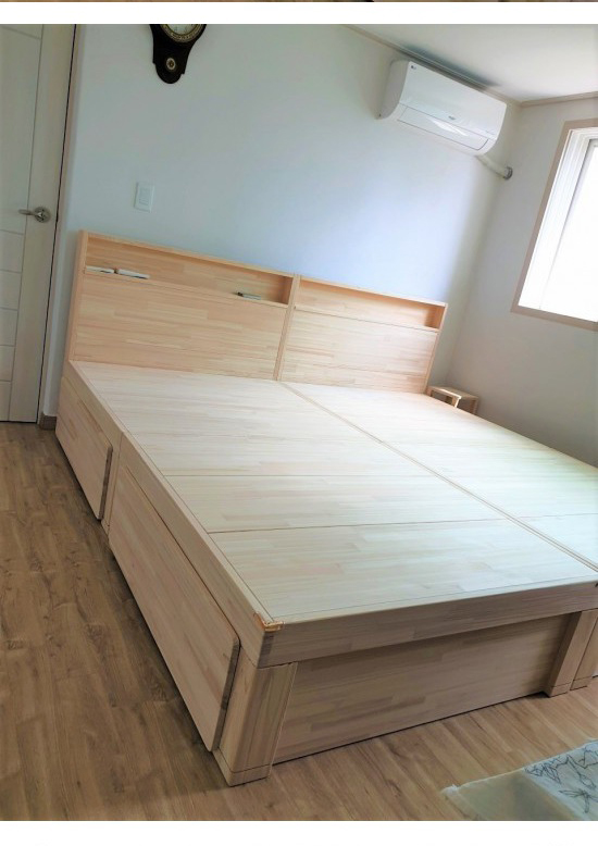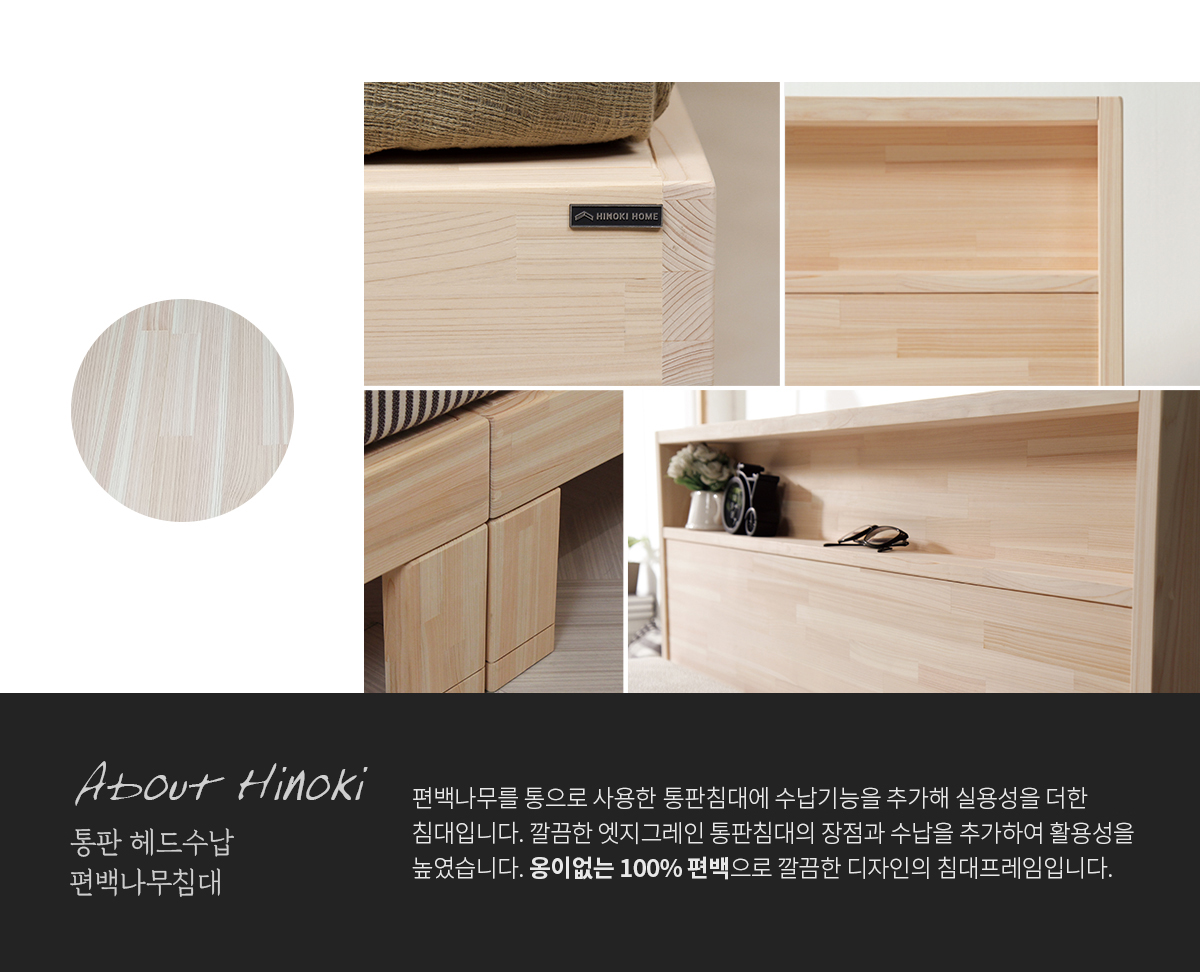 깔끔한 엣지그레인 통판 침대의 장점과 수납을 추가하여 활용성을 높였습니다.
