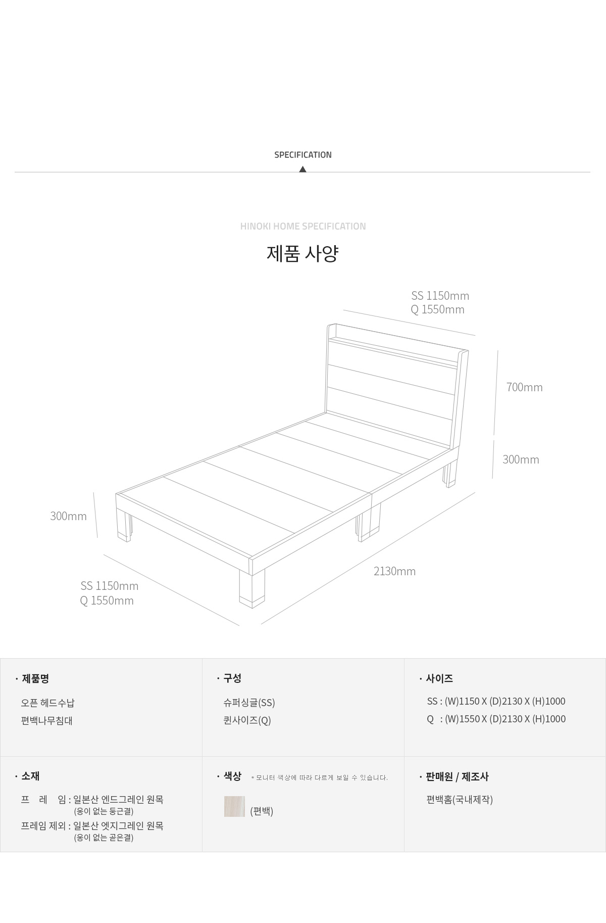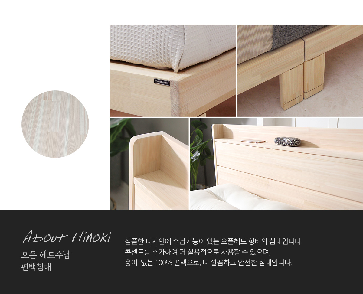 심플한 오픈 수납 헤드 형태의 편백 침대입니다.