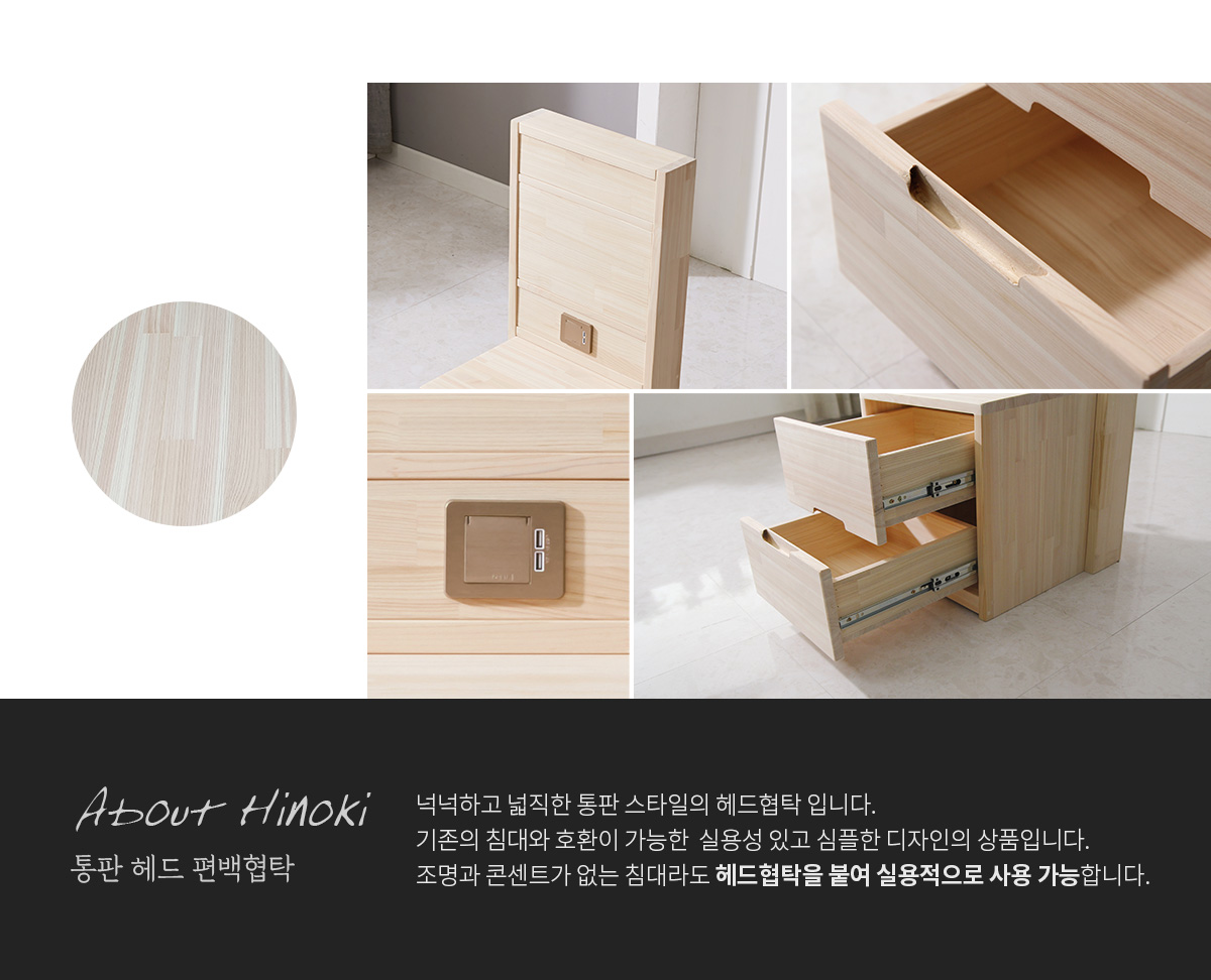 협탁과 콘센트 포함된 통판 스타일의 편백이 특징인 헤드 협탁입니다.