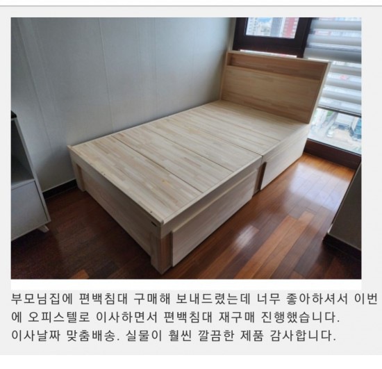 [김*욱] 고객님 [통판헤드수납 편백나무 침대]슈퍼싱글 사이즈(ss) 를 구매 하신 고객님께서 정성스런 후기를 보내 주셨습니다. 부모님집에 편백침대 구매해 보내드렸는데 너무 좋아하셔서 이번에 오피스텔로 이사하면서 편백침대 재구매 진행했습니다. 이사날짜 맞춤배송. 실물이 훨씬 깔끔한 제품 감사합니다. 후기를 남겨주셨습니다. 통판헤드수납형...
